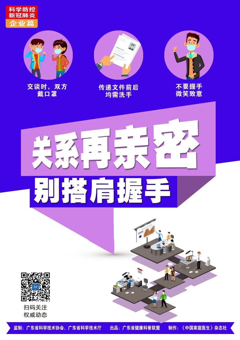 2月10日起,大量企业即将复工,如何做好疫情防控,成为很多人关心的重点。由广东省科学技术协会、广东省科学技术厅监制,广东省健康科普联盟出品,联盟成员单位《中国家庭医生》杂志社制作的科学防疫应急科普宣传画——企业篇,教给你企业疫情防控的“八招”法宝,让你工作防控“两不误”。为方便大家下载打印使用,我们将“科学防控新冠肺炎系列挂图”上传至百度云盘免费共享,内含(长)图片、源文件等,大家可点击页面底部的阅读原文,立即下载。