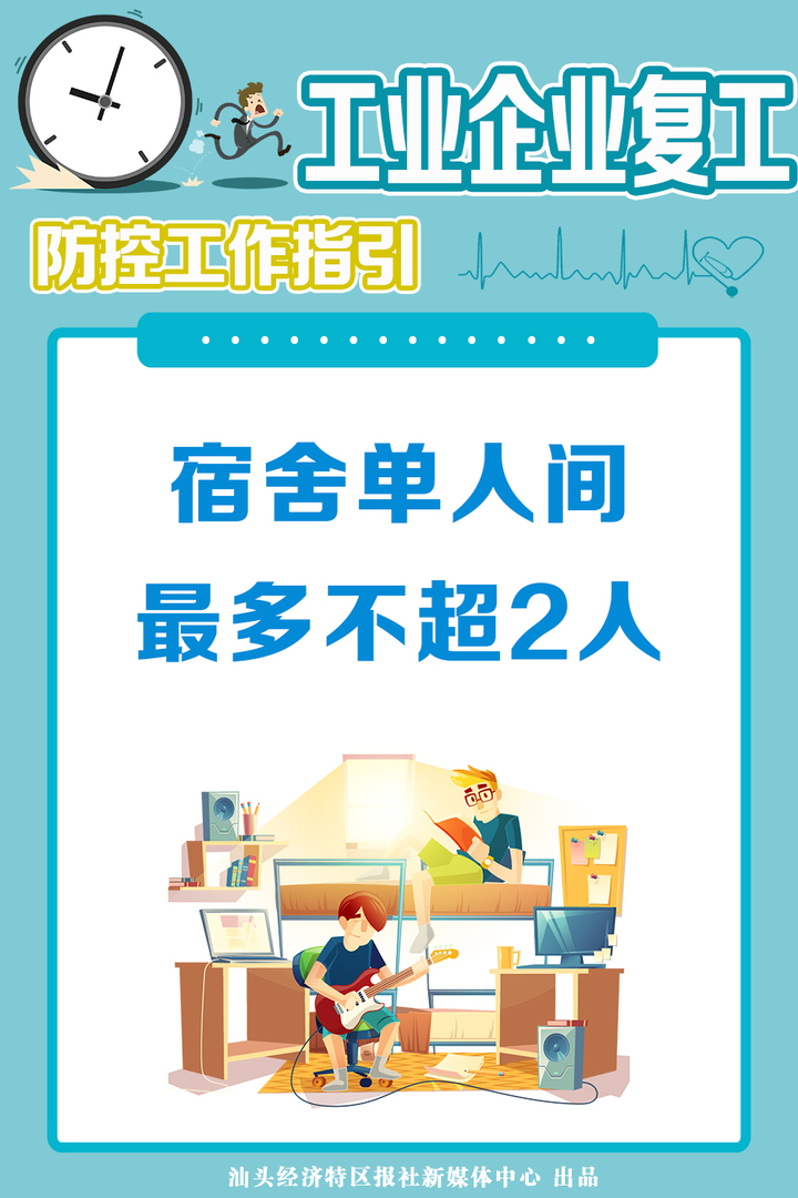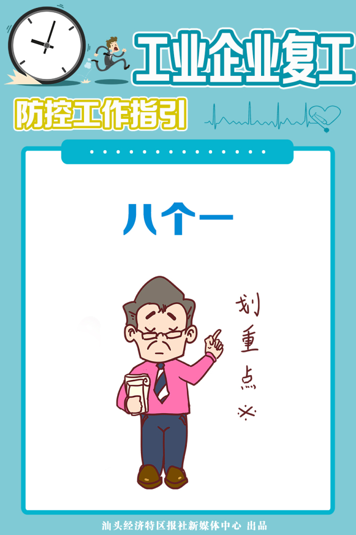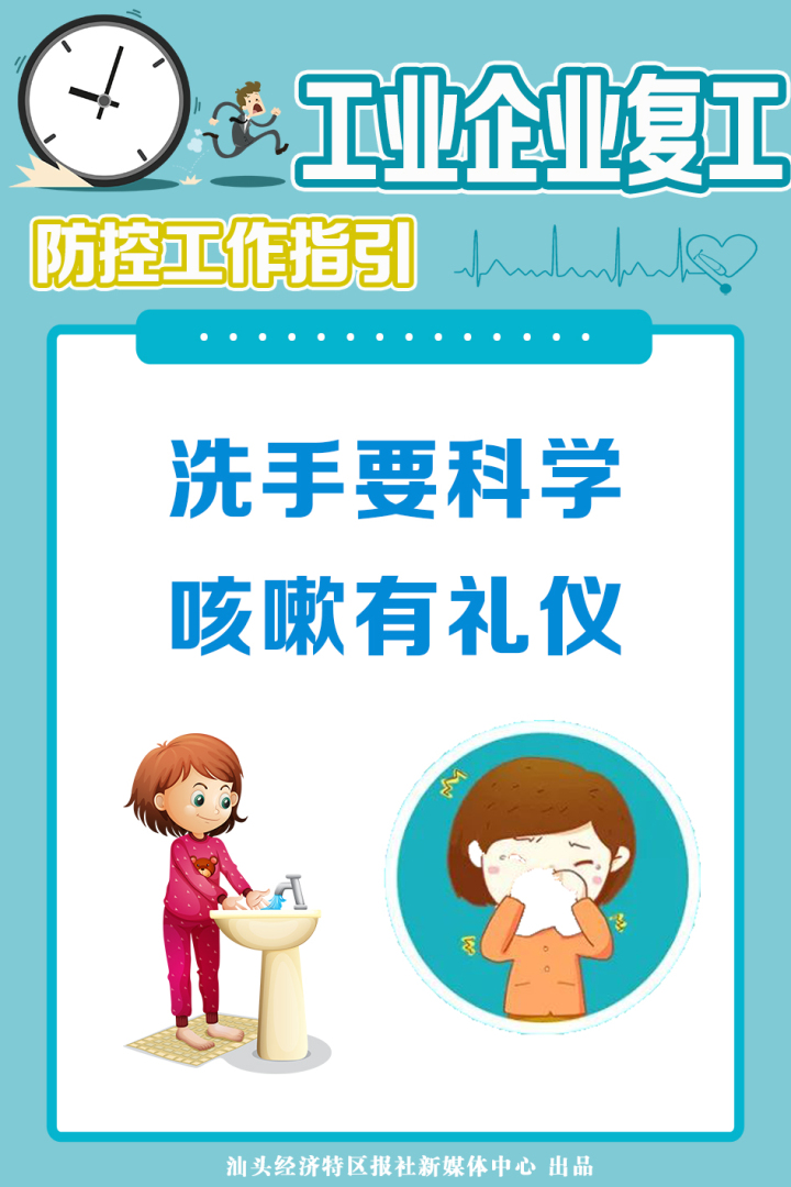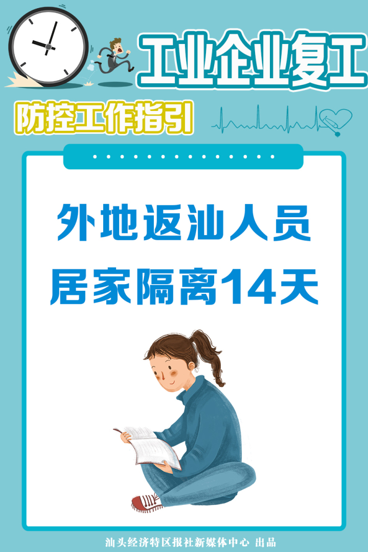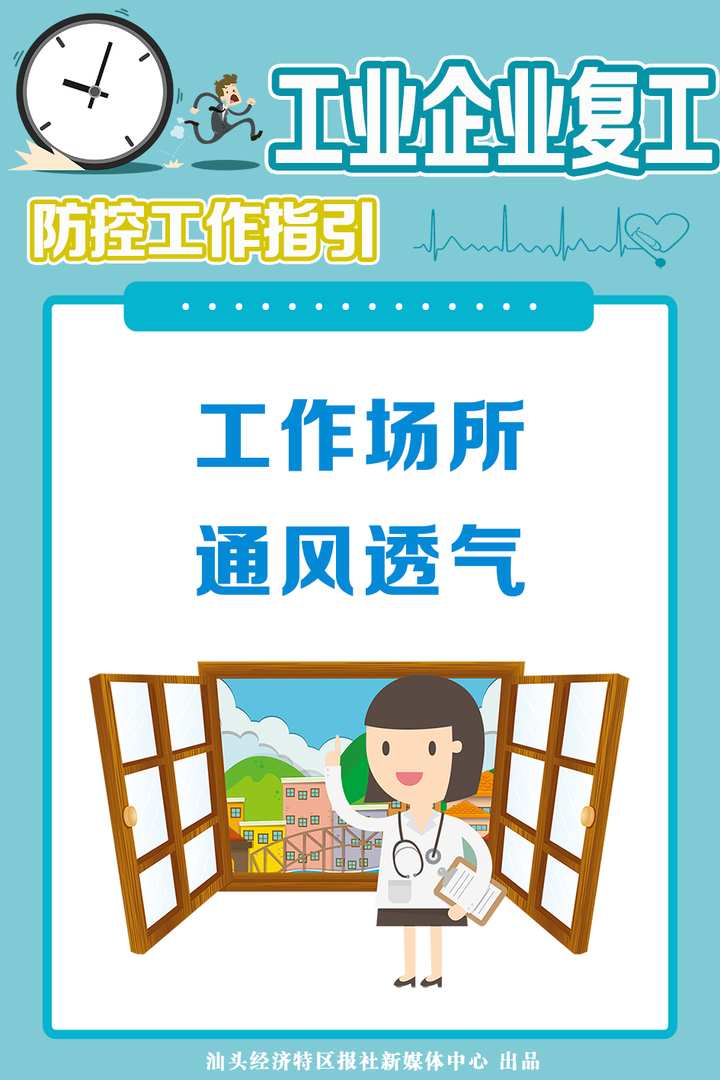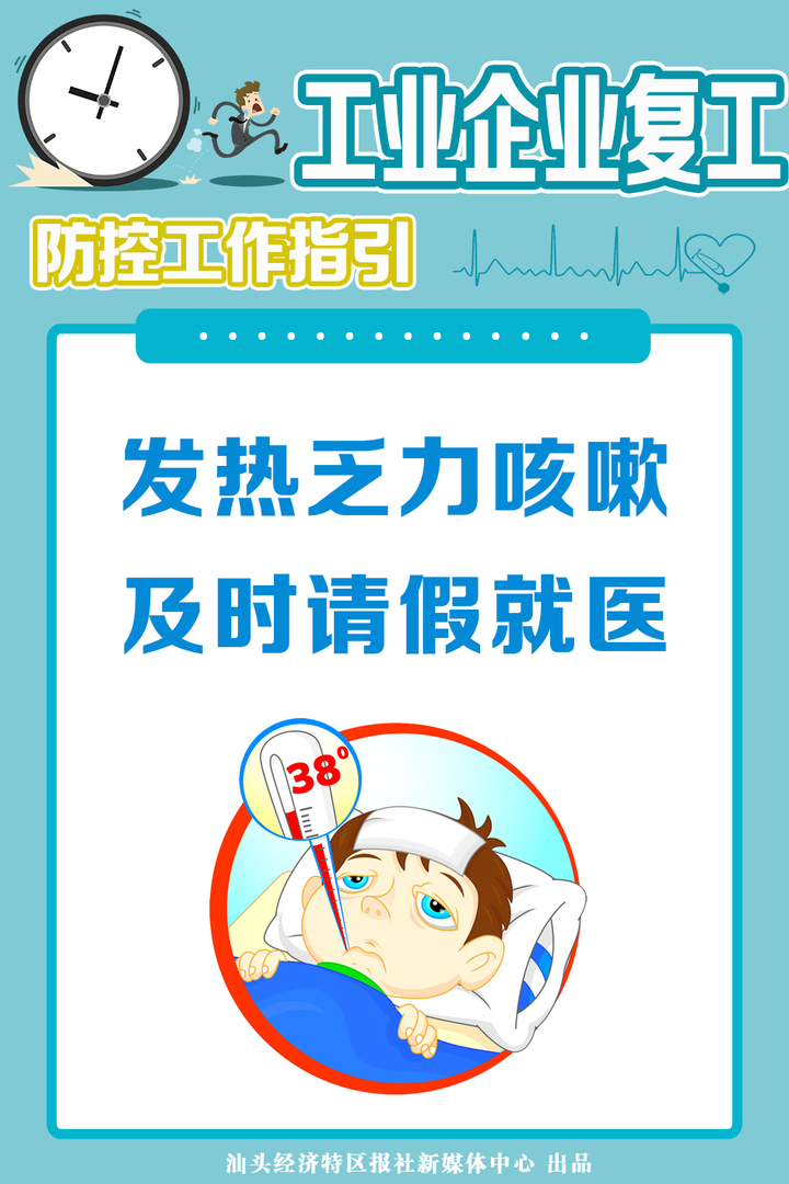 元宵节后复工潮即将到来,疫情防控面临重大考验。为做好疫情防控、重点物资保障、复工复产等工作,汕头经济特区报社新媒体中心整理制作了这份工业企业复工防控工作指引,希望各工业企业复工后要通过了解员工健康状况、测量体温、佩戴口罩、设隔离留观室、开展爱国卫生运动、加强健康教育、强化人文关怀等措施做好防控工作。