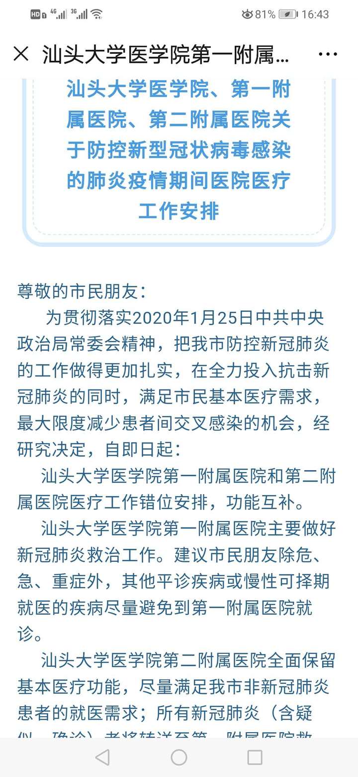 汕头大学医学院也根据疫情发展态势及医院实际,在2月2日发出了联合公告,统筹调配两所附属综合医院医疗专家团队,打出了战“疫”组合拳。即是汕大医学院第一附属医院、第二附属医院对医疗工作进行了错位安排,功能互补,汕大医附一院主要做好新型病毒感染患者的救治工作,所有新型病毒感染(含疑似、确诊)者都转送至附一院救治;汕大医附二院全面保留基本医疗功能,尽量满足我市非新型冠状病毒感染的肺炎患者的就医需求。此外,汕大医学院第一附属医院也利用网络、远程视频会诊系统等,开展互联网诊疗服务,积极引导常见病、慢性病患者通过互联网医疗进行复诊,减少不必要的医院就诊,避免交叉感染。