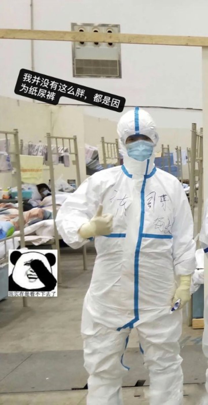 2月12日,周乐敏她们穿着密不透风的防护服进入方舱病房投入工作中,负责病人的体温、血氧饱和度测量,进行疾病宣教及心理护理,发放饭盒、水果和牛奶等等。在忙碌的工作中,虽然有缺氧的感觉,但是坐下来深呼吸后不适感也就缓解了。让周乐敏感到最难受的是身上穿的纸尿裤,因为没有经验穿得不是很好,在工作期间走路来特别别扭,上完6个小时班后腿旁被磨掉一层皮,确实有点疼。第二次上班有了上次的经验后,调整好纸尿裤的穿戴,感觉较为舒服,而缺氧的不适感也没有之前那么严重了,工作也就慢慢的适应了。为了节省紧缺的防护物资,队员们上班前都少喝水以免上厕所,但一个班次下来,大伙身上的纸尿裤普遍都吸水变得“沉甸甸”的,但这不是尿液,都是身穿密闭防护服后闷出来的大量汗水!